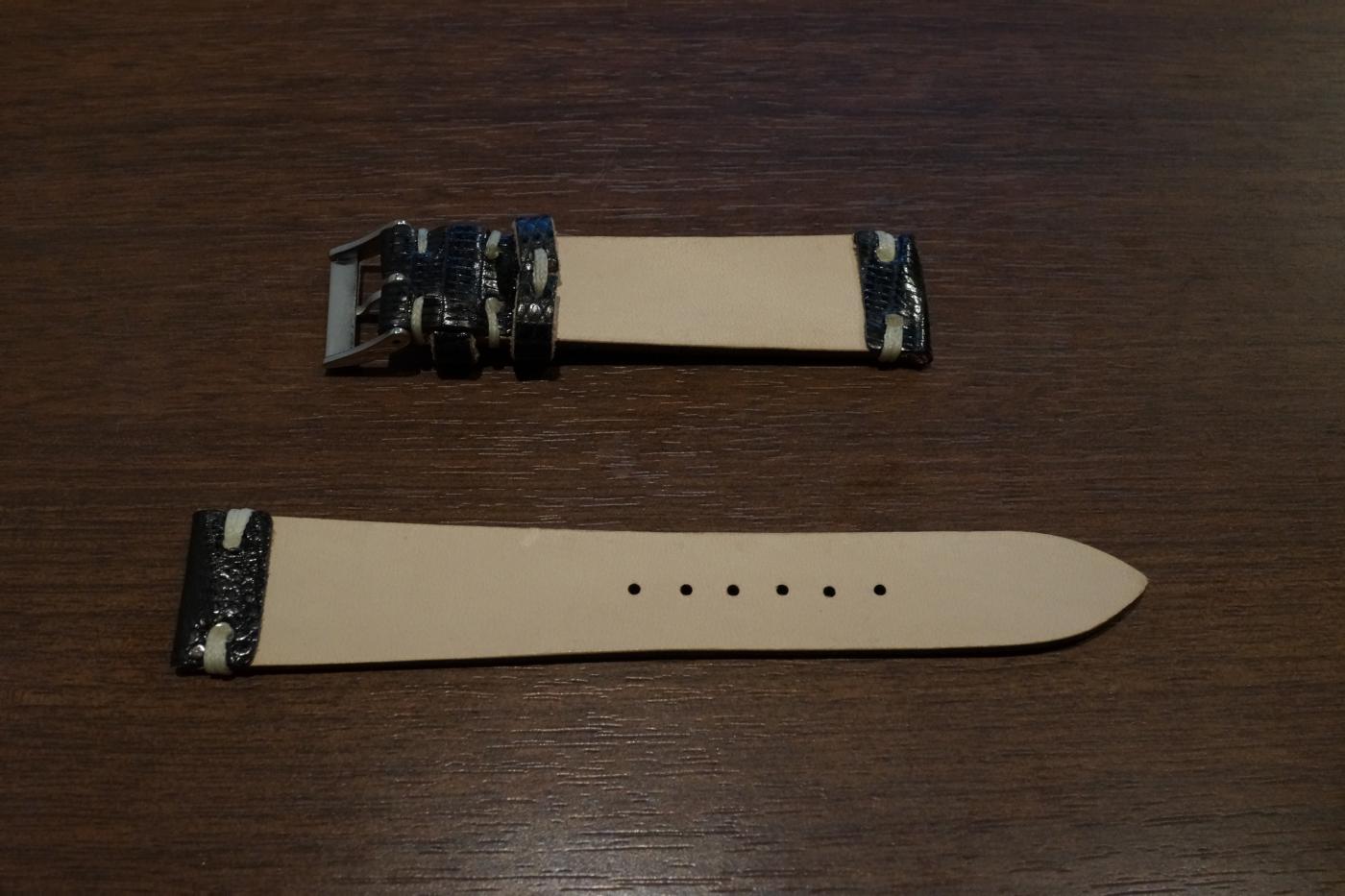 素材:トカゲ本革 サイズ:20mm(尾錠幅16mm) 長さ:12時側約75mm、6時側約120mm 厚さ:約2mm ストラップの裏は写真よりベージュっぽい色合いになります。 ご注文番号R-B20