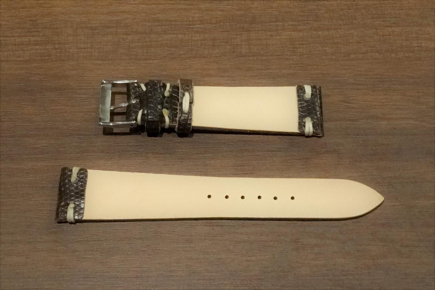 素材:トカゲ本革 サイズ:20mm(尾錠幅16mm) 長さ:12時側約75mm、6時側約120mm 厚さ:約2mm ストラップの裏は写真よりベージュっぽい色合いになります。 ご注文番号R-C20A
