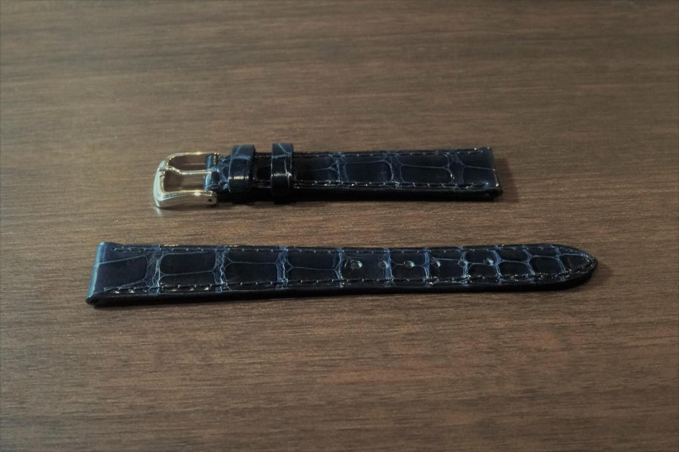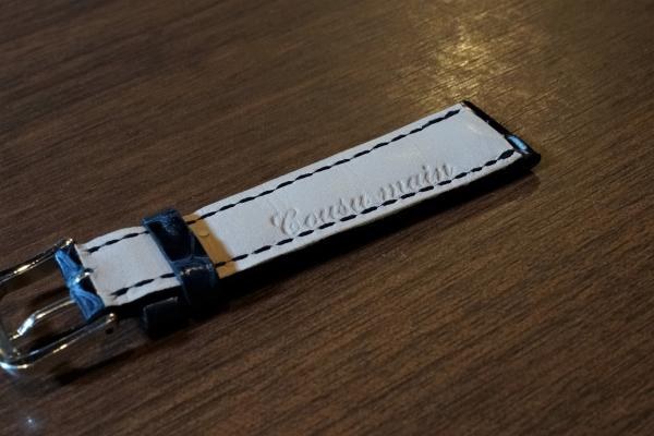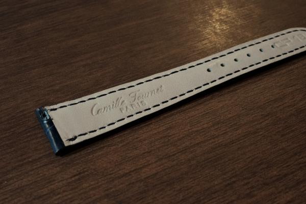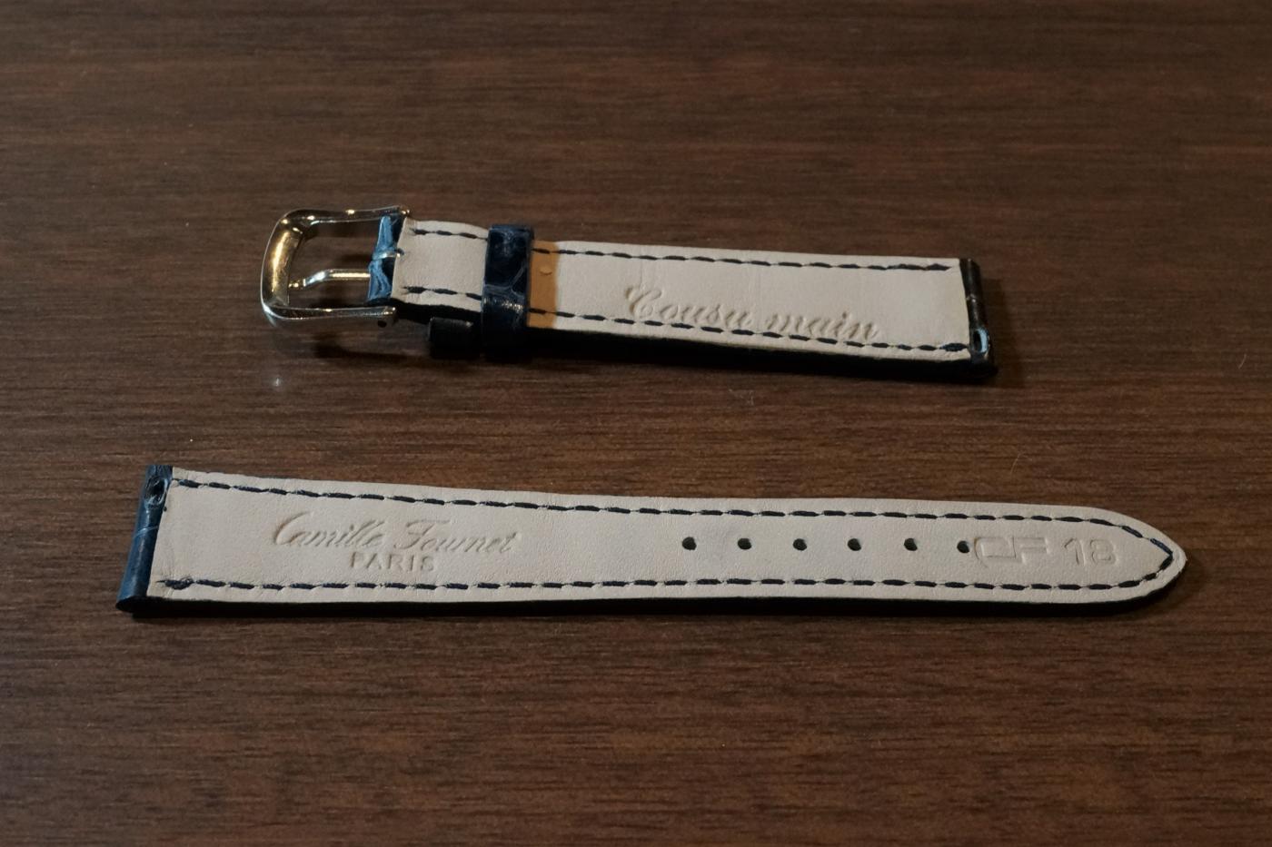 フランスのCamille Fournetのストラップです。 サイズ:18mm(尾錠幅14mm) 長さ:12時側約74mm、6時側約114mm 厚さ:約2mm 尾錠側には高級ラインの証とした「Cousu Main」と筆記体で書かれています。こちらはスライド式バネ棒が対応できるストラップとなっています。 CF-N1
