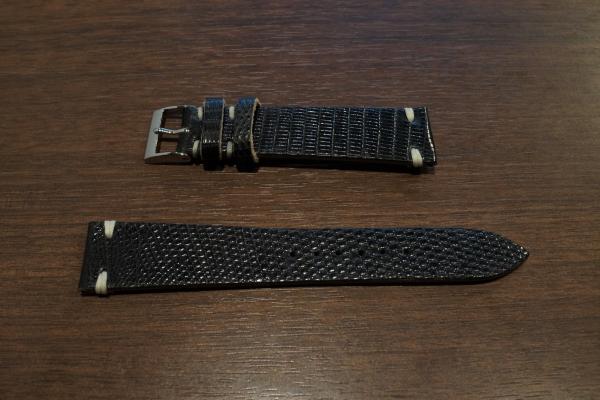 素材:トカゲ本革 サイズ:20mm(尾錠幅16mm) 長さ:12時側約75mm、6時側約120mm 厚さ:約2mm ストラップの裏は写真よりベージュっぽい色合いになります。 ご注文番号R-B20